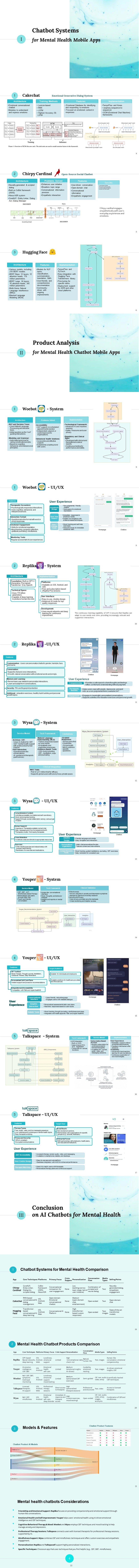 A comprehensive product research report on current mental health AI mobile apps in the market (as of 2021), covering 3 chatbot systems and techniques, and deep insights on 5 leading AI-powered mental health chatbots' UI and data architecture. Based on the deep research report another product is designed for the client Design Mental Health AI Product From 0-to-1 .